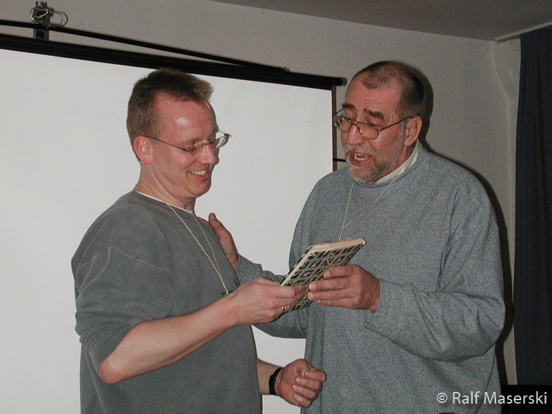Achim bekommt als Dank für die Organisation ein Buch überreicht.