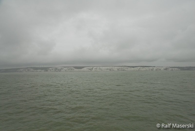 Erster verregneter Blick auf die englische Küste bei Dover.